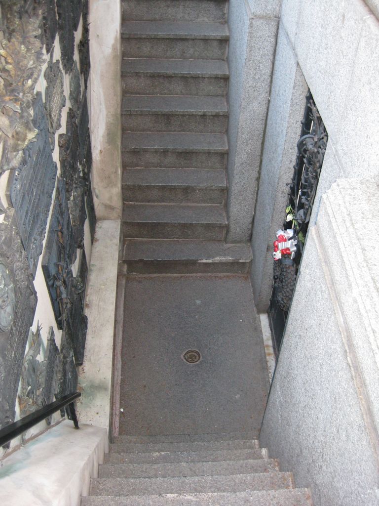 Steps down to the entrance, behind the memorial. On the left are plaques for each individual interred there.