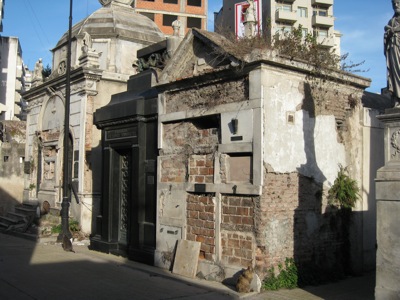 We're not sure how brand-new mausoleums end up sandwiched between old ones (as could be seen all over the place) but apparently, if someone's maintenance fees are not paid, they can be evicted.