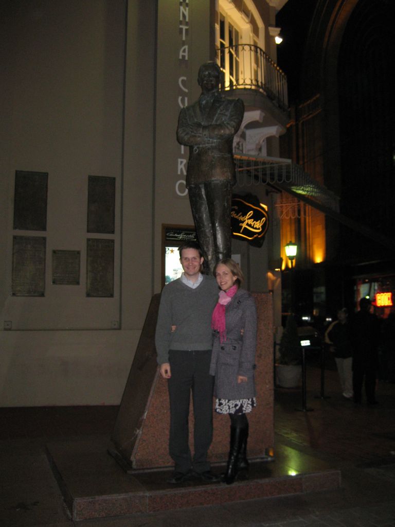 Carlos Gardel is Argentina's most famous tango singer. This statue is in the neighborhood where we had our lessons. Maricel tells us that people go to his grave (in the Recoleta cemetery) to ask for his help with their tango challenges.